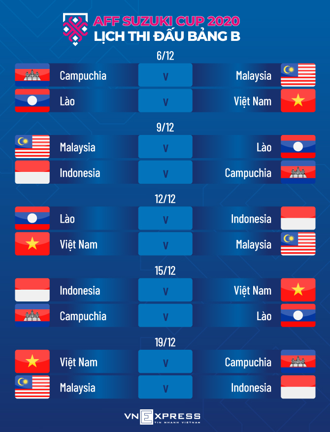 Thái Lan nằm ở bảng A. Sau trận ra quân gặp Timor Leste ngày mai 5/12, thầy trò ông Polking sẽ lần lượt đấu Myanmar ngày 11/12, Philippines ngày 14/12 rồi chủ nhà Singapore ngày 18/12.